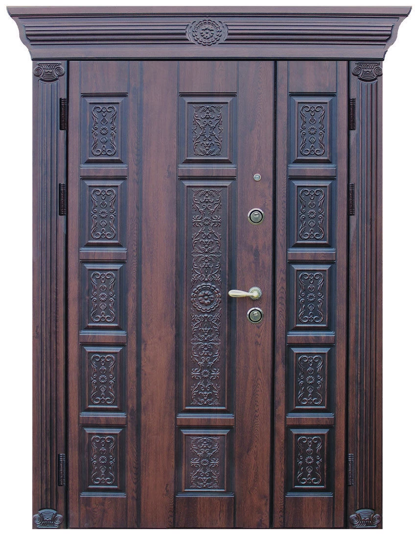 Парадные двери относятся к изделиям премиум-класса. Изготавливаются такие модели из металла толщиной не менее 2,0 мм, конструкция усиливается ребрами жесткости. Основной фактор, делающий парадные двери таковыми – их внешняя отделка. Для декора этих дверей, как правило, используют массив дуба, ясеня или сосны, натуральный шпон, корабельную фанеру, МДФ-панель, покрытую атмосфероустойчивой пленкой Винорит (VINORIT). Декоративные вставки из антивандального стекла, с применением элементов ковки, рисунок, который будет сочетаться с рисунком решеток на окнах, придаст коттеджу неповторимый внешний вид. Можно декорировать дверь витражным узором – и ваш дом заиграет яркими красками. По конструкции парадные двери могут быть как одностворчатыми, так и двустворчатым. При достаточной высоте проема, можно изготовить входную группу с декоративной вставкой сверху – прямоугольную или в виде арки. Терморазрыв в конструкции парадной двери сохранит тепло в доме, и предотвратит промерзание и кондедсирование двери в холодное время года, при этом не требуется обустройство в доме холодного тамбура.